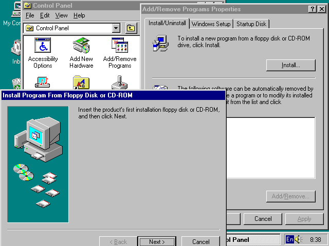 Одна из часто применяемых операций - установка в Windows новых приложений. Она была возможна и в прежних версиях Windows, но с одним серьезным недостатком - от установленных и затем стертых приложений все же оставались файлы, попусту расходующие память жесткого диска и захламляющие файловую систему. В Windows 95 установка новых программ и переинсталляция самой системы может происходить разными способами. К примеру, вы можете задать новый ярлык и указать, какой пусковой файл он запускает. Используя команду Run стартового меню и пусковые файлы Setup или Install приложений, можно выполнить их установку или инсталляцию, пополнив таким образом набор приложений, с которыми будет работать Windows 95. В состав утилит контрольной панели входит утилита Add/Remove Program (Добавление и Стирание программ), которая также может использоваться для установки новых программ, а также их стирания. На "Рис.74. Начало установки программ с помощью утилиты Add/Remove Program"показано (справа) диалоговое окно этой утилиты и окно Мастера, появляющееся при нажатии кнопки Install. В этом случае можно проводить установку программ с гибкого диска или CD-ROM. Поскольку инсталляция различных программ имеет свои отличительные особенности, для ее проведения и используется Мастер. Нажимая кнопку Next в окне Мастера, можно пройти все шаги по инсталляции той или иной программы. Инсталляция крупных программ занимает много времени - подчас до десятков минут и требует слежения за ней. Тем не менее при применении Мастеров она довольно проста и редко сопровождается сбоями.