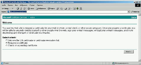 Запрашиваем сертификаты для пользователей. Сертификаты должны получить все пользователи — абоненты защищаемой электронной почты. Обязательное условие: те, кто получает сертификат, должны быть пользователями Wiondows-домена, в котором мы установили СА. Пользователь, получающий сертификат, начинает сеанс, запускает веб-браузер и обращается к Центру сертификации через URL http://name-server/certsrv/, где name-server — имя контроллера домена, на котором установлен СА. Появляется диалоговое окно Microsoft Certificate Services (рис. 2).