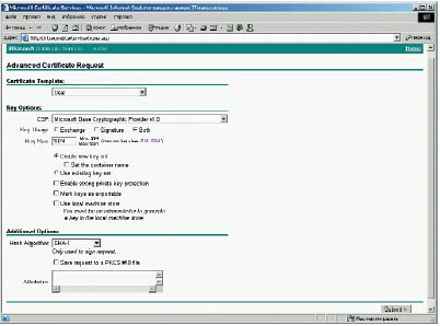 Устанавливаем тип задания дальнейшей обработки Request a sertificate, жмем кнопку Next. На следующий запрос из типов формирования запроса выбираем Advanced request. В ответ на ввод типа появляется на экране окно Advanced Certificate Requests (Расширенного запроса сертификата) с предложением выбрать тип сертификации. Отмечаем в перечне строку Submit a certificate request to this CA using a form. То есть мы запрашиваем формирование сертификата средствами СА с применением формы запроса и нажимаем кнопку Next. Появляется диалоговое окно формы для ввода данных, используемых для формирования сертификата. После ввода информации в поля формы (рис. 3) нажимаем кнопку Next.