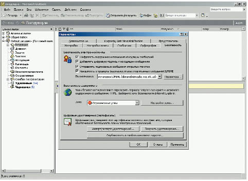 Что касается первого пункта — настройки клиентского ПО Microsoft Outlook — то перечень действий пользователя для получения сертификата уже описан (см. рис. 2). После получения пользователями своих сертификатов выполним настройку клиентского программного обеспечения Microsoft Outlook для отправки защищаемых почтовых сообщений. Запускаем Microsoft Outlook, выбираем в пункте меню Сервис опцию Параметры и в соответствующем окне переходим на закладку Безопасность (рис. 6). Активируем параметры Шифровать содержимое и вложения исходящих сообщений и Добавлять цифровую подпись к исходящим сообщениям.