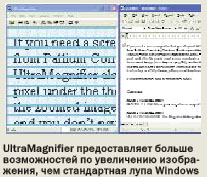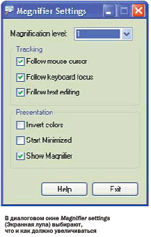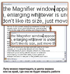 Можно также воспользоваться режимом Start - Run (Пуск - Выполнить), ввести команду magnify и щелкнуть на кнопке OK. В большинстве версий Windows вначале появляется информационное окно. Если оно вам не нужно, включите режим Do not Show this message again (Не показывать больше это сообщение). Для запуска утилиты щелкните на кнопке OK. По умолчанию окно лупы открывается вверху экрана, и все, что попадает под указатель мыши, увеличивается. Для того чтобы изменить размер увеличенной области, поместите указатель мыши на край окна и перетащите его так, чтобы оно увеличилось или уменьшилось. Для того чтобы изменить положение лупы, указатель мыши помещают внутрь окна и перетаскивают его куда нужно. Можно также создать "свободно плавающее" окно в центре экрана. В диалоговом окне Magnifier settings (Экранная лупа) выбирается масштаб и режим увеличения (всегда ли следует увеличивать то, что находится под указателем мыши, должна ли лупа следовать за курсором при вводе и редактировании текста и т.п.). Вначале лучше попробовать использовать параметры по умолчанию. Это особенно удобно в случае, если необходимо показать находящимся в большой комнате людям, что именно вы делаете на компьютере с помощью мыши или какой текст вводите. Если же целью является увеличение отдельного мелкого фрагмента экранного изображения (например, панели инструментов с мелкими кнопочками), отключите режимы Follow keyboard focus (Следовать за фокусом ввода) и Follow text editing (Следовать за вводом текста). Затем поместите окно увеличения на интересующую область и нажмите комбинацию клавиш Alt+M, чтобы отключить режим Follow mouse cursor (Следовать за указателем). Чтобы свернуть диалоговое окно, щелкните на кнопке OK (в Windows 9x) или на кнопке минимизации (в других версиях). Разумеется, мало кому захочется возиться с настройкой лупы перед аудиторией, во время лекции или презентации. Если на клавиатуре есть клавиша Windows, лучше воспользоваться ею. Например, для того чтобы увеличить масштаб, нужно нажать Windows+стрелка вверх, чтобы уменьшить — Windows+стрелка вниз. "Портрет" указателя мышиВо всех версиях Windows, кроме XP, получить копию экрана с указателем мыши довольно сложно. Вместо того чтобы устанавливать специальные утилиты, можно воспользоваться все той же лупой. Расположив все окна на экране, в том числе и Magnifier settings (Экранная лупа), в том виде, в каком они должны быть "сфотографированы", установите коэффициент увеличения равным 1.