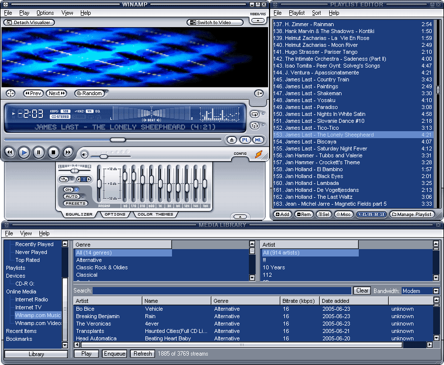 Winamp - знакомый многим медиаплеер (первая версия вышла 7.06.1997г.). Будучи некогда очень популярным, он присутствовал практически на каждом имеющемся в продаже сборнике MP3 музыки. Впрочем, именно медиаплеером Winamp стал начиная с версии 3, а до этого он был ориентирован только лишь на прослушивание музыки. Версия 3 была сильно переработана, появилась поддержка многих вещей, отсутствовавших в версиях 2.хх, однако, она оказалась весьма сырой и изрядно подпортила разработчику - компании Nullsoft, репутацию. Ко всему прочему, появилась конкуренция со стороны Windows Media Player и Winamp стал сдавать позиции. Однако ребята не растерялись и, перескочив загадочным образом через версию 4, выпустили на свет версию 5.00 (рисунок 2). Сами разработчики не признаются о причинах, побудивших их после версии 3 перейти сразу к версии 5, предоставив пользователю самому решать, какое объяснение более правдоподобно: означает ли «5» комбинацию лучших сторон версии 3 и версии 2 (3+2=5); либо же сказалась любовь к числам Фибоначчи; или такой переход должен подчеркнуть сильно увеличенную функциональность. Здесь будет рассмотрена нерусифицированная версия Winamp 5.0914; самую свежую версию с исправленными ошибками и залатанными дырами можно скачать с сайта www.winamp.com. Если ранее Winamp был полностью бесплатен, то в настоящий момент он доступен как в двух бесплатных вариантах (Lite и Full5), так и в платной форме (около 15$). Платная версия позволяет оцифровывать Audio-CD в формат MP3, поддерживает любые доступные скорости при записи музыки на CD (бесплатная же ограничена скоростью 2х) и обеспечивается технической поддержкой со стороны разработчиков. Тех, кто ранее сталкивался с плеером, не удивишь изменившимся внешним видом – winamp и ранее поддерживал разнообразный набор «шкурок», однако в 5 версии появилась возможность выбора между «классическими шкурками» и «современными». Первые оставлены в целях совместимости с мегабайтами нарисованных ранее вариантов интерфейса, а вторые предоставляют широкие возможности по рендерингу – это и поддержка прозрачности, и расширенное управление шрифтами и наличие цветовых тем. Сам плеер тоже производит обманчивое впечатление. Дело в том, что он состоит из набора окон, каждое из которых служит для своей функции. Основным является само окно плеера, знакомое по ранним версиям – со стандартными элементами управления воспроизведением, перемоткой, регулятором громкости и информационным экраном (рисунок 2). Однако за этой кажущейся простотой скрывается целый конструктор возможностей. На рисунке 3 представлен внешний вид Winamp со всеми открытыми рабочими окнами: это и окно визуализации и воспроизведения видео (слева сверху), главное окно (чуть ниже), окно списка воспроизведения (правее), окно медиабиблиотеки (в нижней части), а также триединое, «выезжающее» из основного, окно «эквалайзер + настройки + цветовые схемы» (под основным окном). Рисунок 3. WinAmp со всеми окнами Справедливости ради стоит сказать, что полноценных здесь всего три окна: основное, плейлист и медиабиблиотека – только они снабжены собственными меню, в то время как окно визуалицзаии и эквалайзера «пристыковываются» к основному окну. И если первое еще может быть «отцеплено» и существовать обособлено, то эквалайзер по сути окном не является, однако в дальнейшем к нему все-таки будет использоваться такой термин. 