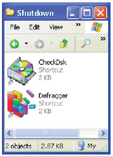 Создав папку для утилит, которые будут выполняться при каждом выходе из Windows, можно сократить время включения компьютера Программы будут выполняться непосредственно перед отключением компьютера, поэтому выбирайте такие утилиты и командные файлы, которые автоматически выполняются и закрываются. Для того чтобы утилиты обслуживания диска работали в таком режиме, могут потребоваться некоторые ключи командной строки. Можно также создать BAT-файл с командами сохранения рабочих документов или ярлык для антивирусного сканера. В последнем случае необходимо правильно сформировать командную строку. Ключи для различных функций сканера есть в его документации. Имена пиктограмм в папке Shutdown не должны содержать кириллических символов и пробелов. Если же такое имя встретится, следует переименовать ярлык. Управление пиктограммамиТеперь создадим командный файл, который будет загружать эти приложения и отключать компьютер. Он создается в любом текстовом редакторе, например в Notepad (Блокнот) из папки Accessories (Стандартные). Первые три строки этого командного файла отвечают за загрузку приложений из папки Shutdown, и поэтому нужны только в Windows 2000 и XP. В первой строке введите команду dir /b, после чего укажите путь к папке Shutdown (заключенный в кавычки — на тот случай если по дороге попадутся имена папок, содержащие пробелы или просто слишком длинные). Затем, в той же строке, поставьте пробел и знак > («больше») и укажите путь к папке с командным файлом, в конце которого стоит имя самого файла. Чтобы не вводить весь путь вручную, просто откройте папку с файлом в Explorer (Проводник) и скопируйте содержимое поля Address (Адрес) — если этой строки не видно, воспользуйтесь командой Tools > Folder Options > View > Display the full path in the address bar (Сервис > Свойства папки > Вид > Показывать полный путь в строке адреса). Ключ /b в команде предназначен для того, чтобы в список выполняемых включались лишь имена файлов — без всякой дополнительной информации. Например, по команде: dir /b "C:\Documents and Settings\Scott\Start Menu\Programs\Shutdown">"c:\batch\run_it.bat" будет создан командный файл run_it.bat, запускающий приложения, список которых указан в папке Shutdown. Во второй строке введите команду cd /d и снова укажите путь к каталогу, в котором находится папка Shutdown. (Ключ /d гарантирует, что по умолчанию будет выбран нужный диск.) Например, если во второй строке написано: cd /d "C:\Documents and Settings\Scott\Start Menu\Programs\Shutdown" — то операционная система перейдет в указанный каталог. В следующей строке запускается сам командный файл. Введите в ней команду наподобие следующей: call c:\batch\run_it.bat где run_it.bat — имя файла, создаваемого в первой строке и содержащего список выполняемых утилит. Далее, независимо от версии Windows, введите по одной строке для каждой утилиты, которая должна выполняться, но отсутствует в папке Shutdown — для Windows 9x/Me это единственный способ автоматического выполнения программ при отключении Windows. Например, если ввести строку: c:\windows\scandskw.exe c: d: /n то при выходе из операционной системы будет выполняться проверка жесткого диска на ошибки. Если те или иная утилита автоматически отключается по завершении, и особенно если ее работа длится долго, поставьте в начале ее строки ключ /w. Тогда выполнение командного файла будет приостановлено до тех пор, пока не отключится данное приложение,— и только после этого выполнится следующая строка.