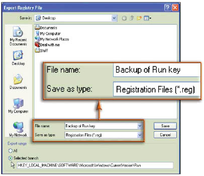 Простой командный файл запускает заданные пользователем утилиты, а потом отключает Windows В конце файла не забудьте добавить строку отключения Windows. При использовании папки Shutdown в Windows XP/2000, чтобы эти задачи успели завершиться до того, как Windows закроется, добавьте ключ –t, после которого (через пробел) укажите время ожидания (в секундах): например, -t 1800 — подождать полчаса. Теперь выберите команду File > Save (Файл > Сохранить), поместите файл в папку, где вы храните другие командные файлы, и присвойте ему какое-нибудь имя с расширением .bat — например, Shutdwn.bat. Затем откройте папку в Explorer (Проводник) и перетащите пиктограмму созданного файла на кнопку Start (Пуск). В меню Start (Пуск) появится новый элемент. Если вы хотите его переименовать или сменить пиктограмму, щелкните на нем правой кнопкой мыши и воспользуйтесь командами Rename (Переименовать) или Properties (Свойства). А чтобы при выходе из Windows автоматически выполнялись выбранные вами приложения, вместо того чтобы воспользоваться стандартной командой завершения работы, выберите из меню Start (Пуск) эту пиктограмму. Отмена автозапускаУ папки с пиктограммами может быть еще одно удобное применение — возможность навести порядок в системном реестре. Многие приложения пытаются поместить себя, или хотя бы один из своих модулей, в системную область панели задач (трей) и «сидеть» там в фоновом режиме, проедая системные ресурсы без сколько-нибудь ощутимой пользы. Большинство из них при инсталляции вносят свои команды в меню Startup (Автозагрузка). Если вы пользуетесь такими программами не постоянно, а лишь время от времени, для их запуска можно воспользоваться, например, утилитой Startup Control Panel. К сожалению, некоторые приложения (такие как QuickTime для Windows) «освежают» свои записи в меню Startup (Автозагрузка) не только при каждой переустановке и обновлении, но и при каждом запуске. Чтобы избавиться от такой назойливости, следует, прежде чем удалять эти приложения из папки Startup (Автозагрузка), изменить один из ключей реестра. Для этого выберите команду Start > Run (Пуск > Выполнить), введите команду regedit и нажмите Enter. Перейдите в папку (в реестре они называются «ключами»), которая содержит команду запуска данного приложения. Что именно нужно искать, можно догадаться по свойствам пиктограмм из папки Startup (Автозагрузка), однако нужная команда, скорее всего, находится в ключе HKEY_CURRENT_USER\Software\Microsoft\Windows\CurrentVersion\Run или HKEY_LOCAL_MACHINE\SOFTWARE\Microsoft\Windows\CurrentVersion\Run. Например, именно в последнем ключе располагается модуль QuickTime. Выбрав ключ на левой панели, где представлено дерево реестра, прежде всего создайте, на всякий случай, резервную копию системного реестра. Для этого выберите команду Registry > Export (Реестр > Экспортировать) или File > Export (Файл > Экспортировать) — в зависимости от версии Windows. Перейдите к папке, где будет сохранена резервная копия, выделите выбранную ветвь, присвойте имя экспортируемому файлу и щелкните на кнопке Save (Сохранить).