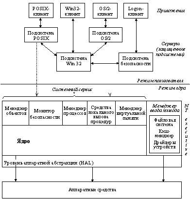 Рис. 1.1. Структура ОС на базе микроядра Использование концепции микроядра способствует переносимости операционных систем, поскольку весь машинно-зависимый код изолирован в микроядре, а значит для переноса системы на новый процессор требуется меньше изменений, и все они логически сгруппированы вместе. Операционная система Windows NT может работать на компьютерах, построенных на базе процессоров Intel, PowerPC, DEC Alpha, MIPS. Технология микроядер является основой построения множественных прикладных сред, которые обеспечивают совместимость программ, написанных для разных ОС. Абстрагируя интерфейсы прикладных программ от расположенных ниже операционных систем, микроядра позволяют гарантировать, что вложения в прикладные программы не пропадут в течение нескольких лет, даже если будут сменяться операционные системы и процессоры. В среде Windows NT, кроме "родных" 32-битовых приложений, могут выполняться приложения MS-DOS, 16-битовые Windows-приложения, Posix- и OS/2-приложения. Однако, такая гибкость не дается даром. Пересылка сообщений не так быстра, как обычные вызовы функций, и ее оптимизация является критическим фактором успеха операционной системы на основе микроядра. Поэтому разработчики Windows NT отказались от модели микроядра в ее чистом виде. Кроме собственно микроядра, в привилегированном режиме работает часть Windows NT, называемая executive - исполнительная подсистема. Она включает ряд компонентов, которые управляют виртуальной памятью, объектами, вводом-выводом и файловой системой (включая сетевые драйверы), взаимодействием процессов и, частично, системой безопасности. Часть Windows NT, работающая в пользовательском режиме состоит из серверов Windows NT, называемых также защищенными подсистемами (рисунок 1.2).