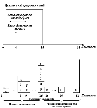 1.3. Планирование процессов и нитейВ отличие от Windows, в которой реализована многозадачность без вытеснения (non-preemptive multitasking), в Windows NT используется механизм многозадачности с вытеснением (preemptive multitasking). Windows NT поддерживает симметричную мультипроцессорную организацию вычислительного процесса, в соответствии с которой ОС может выполняться на любом свободном процессоре или на всех процессорах одновременно, разделяя память между ними. Так как многозадачность реализуется на уровне нитей, разные части одного и того же процесса могут действительно выполняться параллельно. Следовательно, многонитевые серверы могут одновременно обслуживать более одного клиента. Для того, чтобы прикладная программа могла использовать несколько нитей, не нужно предусматривать этого в ее алгоритме. Отдельная нить создается для каждой операции. Например, в одной нити программа может воспроизводить сложную графическую форму, а в другой - использоваться для редактирования объемного чертежа. Каждая из этих нитей (или, с точки зрения пользователя, операций) работает на отдельном процессоре, не требуя никаких управляющих вмешательств со стороны приложения. Нити внутри процесса используют общую область памяти и, следовательно, могут очень просто обмениваться данными. Для управления нитями Windows NT использует механизм приоритетов. В определенные моменты производятся оценка приоритетов и перераспределение нитей по процессорам, в результате чего последовательные стадии одной нити программы могут выполняться разными процессорами или откладываться до высвобождения очередного процессора. Каждой нити присваивается число - приоритет, и нити с более высоким приоритетом выполняются раньше нитей с меньшим приоритетом. В самом начале нить получает приоритет от процесса, который создает ее. В свою очередь и процесс получает приоритет в тот момент, когда его создает подсистема среды. Значение базового приоритета процесса присваивается ему системой по умолчанию или системным администратором. Нить наследует этот базовый приоритет и может изменить его, немного увеличив или уменьшив. На основании получившегося в результате приоритета, называемого приоритетом планирования, начинается выполнение нити. В ходе выполнения приоритет планирования может меняться. Windows NT поддерживает 32 уровня приоритетов, разделенных на два класса - класс реального времени и класс переменных приоритетов (рисунок 1.3). Нити реального времени, приоритеты которых находятся в диапазоне от 16 до 31, являются более приоритетными процессами и используются для выполнения задач, критичных ко времени. В Windows NT определено 4 класса приоритетов процессов: