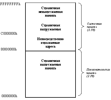 Рис. 1.4. Виртуальное адресное пространство Верхняя часть системной памяти управляется менеджером виртуальной памяти и используется для хранения остальных системных данных и кода. Часть этой области резервируется для кода и данных, которые могут быть вытеснены на диск с помощью страничного механизма, а другая часть никогда не вытесняется из памяти (в ней, например, размещается код, который осуществляет страничный обмен). В составе менеджера виртуальной памяти имеется такой компонент, как пейджер (pager). Этот код перемещает страницы между диском и памятью, представляя собой промежуточное звено между аппаратными механизмами и программно-реализуемыми стратегиями. В его функции входит: