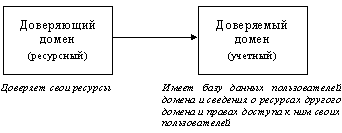 6. Многодоменная сеть Windows NT6.1. Доверительные отношенияДля того, чтобы не заводить учетную информацию на одного и того же пользователя в разных доменах, между доменами можно установить доверительные отношения. Доверительные отношения обеспечивают транзитную аутентификацию, при которой пользователь имеет только одну учетную запись в одном домене, но может получить доступ к ресурсам всех доменов сети.