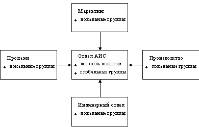 6.4.3. Модель с несколькими главными доменами Эта модель предназначена для больших предприятий, которые хотят поддерживать централизованное администрирование. Эта модель в наибольшей степени масштабируема. В данной модели имеется небольшое число главных доменов. Главные домены используются как учетные домены, причем учетная информация каждого пользователя создается только в одном из главных доменов. Сотрудники отдела Автоматизированных Информационных Систем (АИС) предприятия могут администрировать все главные домены, в то время как ресурсные домены могут администрировать сотрудники соответствующих отделов. Каждый главный домен доверяет всем остальным главным доменам. Каждый домен отдела доверяет всем главным доменам, но доменам отделов нет необходимости доверять друг другу.