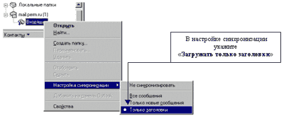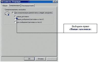 2.3.1 В окне "Свойства" необходимо перейти на закладку синхронизация и установить параметр "При синхронизации данной папки следует загружать" - "Новые заголовки".