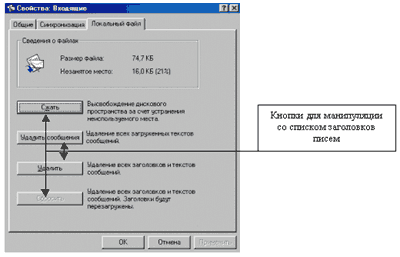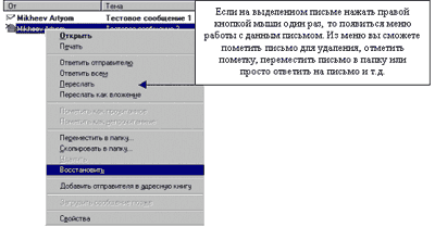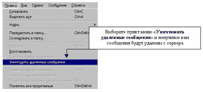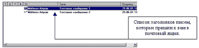 Теперь вы можете оперировать с заголовками. 5.1. Чтение содержимого письма.Для того чтобы прочитать содержимое письма вам просто необходимо нажать на нем левой кнопочкой мыши 2 раза. Письмо откроется в новом окне, затем произойдет загрузка его содержимого. 5.2. Выделение группы писем.Для выделения всех писем достаточно переключиться на латинскую раскладку - нажать клавишу Control и удерживая её нажать клавишу А. Для выборочного выделения писем, необходимо переключиться на латинскую раскладку и удерживая клавишу Control нажимать левой клавишей мыши на нужные заголовки писем. 5.3. Сохранение письма на вашем жестком диске.Для того, чтобы сохранить письмо на жестком диске необходимо нажать на него правой клавишей мыши и выбрать пункт меню "Переместить в папку" - затем указать папку в списке, в которую необходимо переместит письмо - в результате письмо со всем его содержимым будет сохранено у вас на жестком диске в указанной вами папке. 5.4. Пометка письма для удаления.Для того чтобы пометить письмо для последующего удаления необходимо нажать на него один раз левой клавишей мыши, так чтобы оно выделилось и нажать клавишу "Delete" на клавиатуре. Письмо будет зачеркнуто, но на самом деле не будет удалено. 5.5. Удаление письма.Чтобы окончательно удалить письмо с сервера вам необходимо пометить его для удаления, как описано в пункте 5.4., затем перейти в меню правка и выбрать пункт "Уничтожить удаленные сообщения".