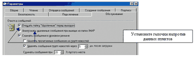 3. Настройка синхронизации заголовков.Необходимо нажать правой кнопочкой мышки на подпапку "Входящие" - Выбрать пункт меню "Настройка синхронизации" - в появившемся меню выбрать "Только заголовки". Это нужно, для того чтобы при открытии подпапки "Входящие" к вам на компьютер загружались только заголовки писем, либо все сообщения, либо только новые сообщения. 4. Настройка программы "Outlook Express" для корректной работы с IMAP.Вам необходимо войти в меню "Сервис" - "Параметры" 4.1. Перейдите на закладку "Обслуживание" и установите галочки следующим образом, представленном на рисунке.