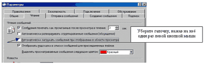4.2. Перейдите на закладку "Чтение" и удалите галочку напротив пункта "Автоматически загружать сообщение при отображении в области просмотра". 5. Работа с почтой по протоколу IMAP.Все необходимые настройки сделаны. Теперь разберем как работать с полученными заголовками. Поскольку заголовок письма - это достаточно малая часть всего письма и следовательно получаться она будет гораздо меньше по времени, чем письмо целиком. Поэтому вы сможете быстро получить нужную почту, а ненужную так же быстро удалить, не загружая. При переходе в подпапку "Входящие" происходит загрузка сообщений по установленному правилу ("Только заголовки"). В результате вы получите заголовки писем с информацией от кого письмо и с темой.