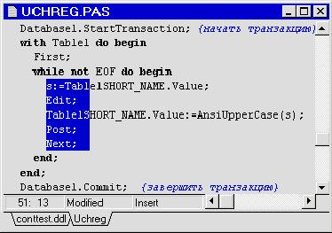 После запуска Delphi в верхнем окне горизонтально располагаются иконки палитры компонент. Если курсор задерживается на одной из иконок, под ней в желтом прямоугольнике появляется подсказка Из этой палитры компонент вы можете выбирать компоненты, из которых можно строить приложения. Компоненты включают в себя как визуальные, так и логические компоненты. Такие вещи, как кнопки, поля редактирования - это визуальные компоненты; а таблицы, отчеты - это логические. Понятно, что поскольку в Delphi вы визуальным образом строите свою программу, все эти компоненты имеют свое графическое представление в поле форм для того, чтобы можно было бы ими соответствующим образом оперировать. Но для работающей программы видимыми остаются только визуальные компоненты. Компоненты сгруппированы на страницах палитры по своим функциям. К примеру, компоненты, представляющие Windows "common dialogs" все размещены на странице палитры с названием "Dialogs". Delphi позволяет разработчикам настроить среду для максимального удобства. Вы можете легко изменить палитру компонент, инструментальную линейку, а также настраивать выделение синтаксиса цветом. Заметим, что в Delphi вы можете определить свою группу компонент и разместить ее на странице палитры, а если возникнет необходимость, перегруппировать компоненты или удалить неиспользуемые. Интеллектуальный редактор