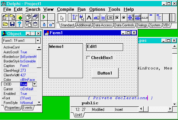 Delphi позволяет использовать библиотеку визуальных компонент для быстрого создания надежных приложений, которые легко расширяются до приложений с архитектурой клиент-сервер. Другими словами, Вы можете создать приложение, работающее с локальным сервером InterBase, а затем использовать созданное приложение, соединяясь с удаленным SQL-сервером через SQL-Links. Библиотека объектных Визуальных КомпонентКомпоненты, используемые при разработке в Delphi (и также собственно самим Delphi), встроены в среду разработки приложений и представляют из себя набор типов объектов, используемых в качестве фундамента при строительстве приложения. Этот костяк называется Visual Component Library (VCL). В VCL есть такие стандартные элементы управления, как строки редактирования, статические элементы управления, строки редактирования со списками, списки объектов. Еще имеются такие компоненты, которые ранее были доступны только в библиотеках третьих фирм: табличные элементы управления, закладки, многостраничные записные книжки. VCL содержит специальный объект, предоставлющий интерфейс графических устройств Windows, и позволяющий разработчикам рисовать, не заботясь об обычных для программирования в среде Windows деталях. Ключевой особенностью Delphi является возможность не только использовать визуальные компоненты для строительства приложений, но и создание новых компонент. Такая возможность позволяет разработчикам не переходить в другую среду разработки, а наоборот, встраивать новые инструменты в существующую среду. Кроме того, можно улучшить или полностью заменить существующие по умолчанию в Delphi компоненты. Здесь следует отметить, что обычных ограничений, присущих средам визуальной разработки, в Delphi нет. Сам Delphi написан при помощи Delphi, что говорит об отсутствии таких ограничений. Классы объектов построены в виде иерархии, состоящей из абстрактных, промежуточных, и готовых компонент. Разработчик может пользоваться готовыми компонентами, создавать собственные на основе абстрактных или промежуточных, а также создавать собственные объекты. Язык программирования Delphi базируется на Borland Object Pascal. Кроме того, Delphi поддерживает такие низкоуровневые особенности, как подклассы элементов управления Windows, перекрытие цикла обработки сообщений Windows, использование встроенного ассемблера. Формы, модули и метод разработки "Two-Way Tools"Формы - это объекты, в которые вы помещаете другие объекты для создания пользовательского интерфейса вашего приложения. Модули состоят из кода, который реализует функционирование вашего приложения, обработчики событий для форм и их компонент. Информация о формах хранится в двух типах файлов - .dfm и .pas, причем первый тип файла - двоичный - хранит образ формы и ее свойства, второй тип описывает функционирование обработчиков событий и поведение компонент. Оба файла автоматически синхронизируются Delphi, так что если добавить новую форму в ваш проект, связанный с ним файл .pas автоматически будет создан, и его имя будет добавлено в проект. Такая синхронизация и делает Delphi two-way-инструментом, обеспечивая полное соответствие между кодом и визуальным представлением. Как только вы добавите новый объект или код, Delphi устанавливает т.н. "кодовую синхронизацию" между визуальными элементами и соответствующими им кодовыми представлениями. Например, предположим, вы добавили оп