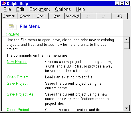 Как Вы увидите позже, большинство операций из пункта меню "File" можно выполнить с помощью Менеджера Проекта (Project Manager), который можно вызвать из пункта меню View. Некоторые операции доступны и через SpeedBar. Данная стратегия типична для Delphi: она предоставляет несколько путей для решения одной и той же задачи, Вы сами можете решать, какой из них более эффективен в данной ситуации. Каждая строка пункта меню "File" объяснена в Справочнике. Выберите меню "File" и нажмите F1, появится экран справочника, как на рис.1.