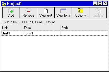 Рис.3: Кнопки сверху используются для удаления и добавления модулей в проект. Вы можете использовать кнопки с плюсом и минусом для добавления и удаления файлов в проекте. Эти изменения влияют на файлы с исходным текстом, то есть, если добавить в проект модуль, то ссылка на него появится в файле с расширением DPR. Краткое описание других кнопок :