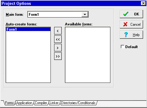 Рис 4. На странице Forms можно выбрать главную форму проекта. Изменения, которые Вы сделаете, отобразятся в соответствующем файле DPR. Например, в нижеследующем проекте, Form1 является главной, поскольку появляется первой в главном блоке программы: