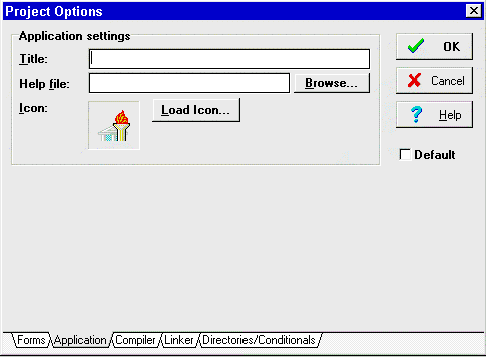 Вы также можете использовать эту страницу для определения, будет ли данная форма создаваться автоматически при старте программы. Если форма создается не автоматически, а по ходу выполнения программы, то для этого нужно использовать процедуру Create. Кстати, в секции Uses имя формы в фигурных скобках является существенным для Менеджера Проектов и удалять его не стоит. Не нужно вообще ничего изменять вручную в файле проекта, если только Вы не захотели создать DLL, но об этом позднее. Страница Applications На странице Applications, см. рис.5, вы можете задать заголовок (Title), файл помощи (Help file) и пиктограмму (Icon) для проекта.