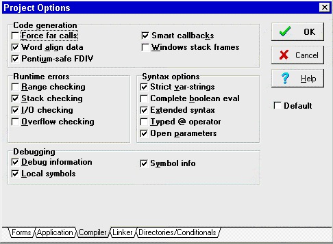 Пункт меню "Compile" В пункте меню "Compile" проект можно скомпилировать (compile) или перестроить (build). Если выбрать Compile или Run, то Delphi перекомпилирует только те модули, которые изменились со времени последней компиляции. Build all, с другой стороны, перекомпилирует все модули, исходные тексты которых доступны. Команда Syntax Check только проверяет правильность кода программы, но не обновляет DCU файлы. В самом низу - пункт Information, который выдает информацию о программе: размеры сегментов кода, данных и стека, размер локальной динамической памяти и количество скомпилированных строк. Пункт меню "Run" Можно использовать "Run" для компиляции и запуска программы и для указания параметров командной строки для передачи в программу. Здесь же имеются опции для режима отладки. Пункт меню Options | Project"Options" наиболее сложная часть системного меню. Это центр управления, из которого вы можете изменять установки для проекта и для всей рабочей среды Delphi. В "Options" есть семь пунктов: Project Первые четыре пункта вызывают диалоговые окна. Ниже приведено общее описание пункта меню "Options":