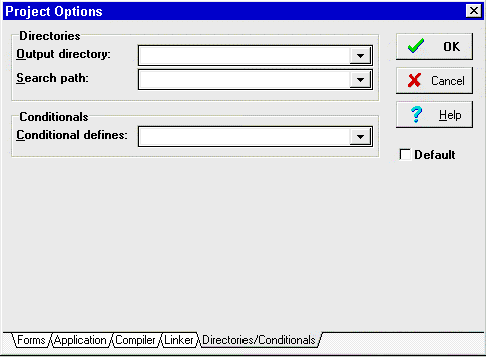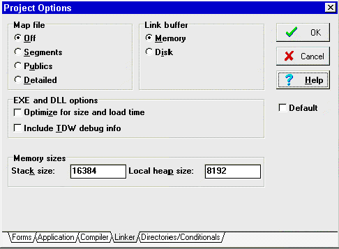 Рис.7: Страница линковщика. Установки отладчика рассматриваются ниже. Если буфер линковщика расположен в памяти, то линковка происходит быстрее. Размер стека (Stack Size) и локальной динамической памяти (Heap Size) весьма важны. Delphi устанавливает по умолчанию и Stack Size, и Heap Size в 8192 байт каждый. Вам может понадобиться изменить размер стека в программе, но обычно это не более 32Кб. В сумме эти два размера не должны превышать 64Кб, иначе будет выдаваться ошибка при компиляции программы. Страница Directories/Conditionals Страница Directories/Conditionals, рис.8, дает возможность расширить число директорий, в которых компилятор и линковщик ищут DCU файлы.