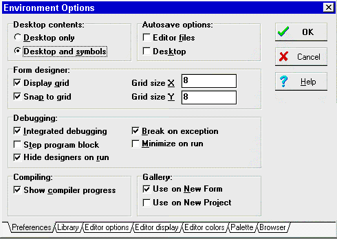 Рис.8: Страница Directories/Conditionals. В файле DELPHI.INI содержится еще один список директорий. Запомните, что в OPT файле - список директорий для конкретного проекта, а в файле DELPHI.INI - список относится к любому проекту. Output directory - выходная директория, куда складываются EXE и DCU файлы, получающиеся при компиляции. Search path - список директорий для поиска DCU файлов при линковке. Директории перечисляются через точку с запятой ; Conditional defines - для опытного программиста и на первом этапе создания проекта не требуется. Для информации можно вызвать Справочник (on-line help). Конфигурация среды программирования (IDE)Пункт меню "Options | Environment" предоставляет Вам большой набор страниц и управляющих элементов, которые определяют внешний вид и работу IDE. Delphi позволяет сделать следующие важные настройки: