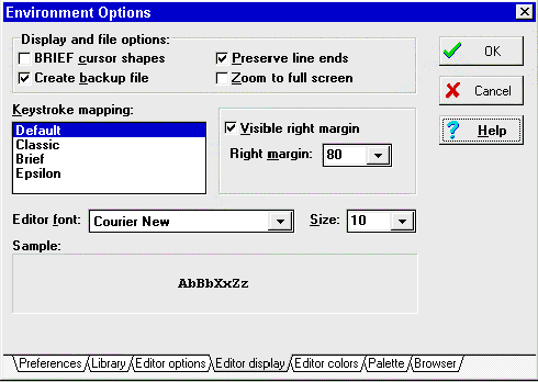 Рис.11: Страница Editor Colors. Существует несколько способов изменить назначение "горячих" клавиш, используемых Редактором. Например, многие пользователи привыкли, что по клавише F5 максимизируется окно Редактора. Для этого им надо использовать расположение клавиш, называемое "Classic" (Keystroke mapping : Classic). Всего есть четыре вида конфигурации клавиш: