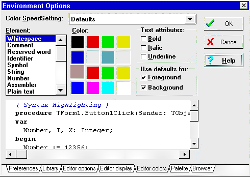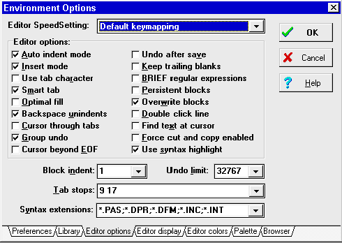 Рис.12: На странице Editor Options можно настроить тонкие детали работы Редактора. Многие из установок на данной странице не очень важны для большинства пользователей, поэтому остановимся лишь на некоторых. "Use syntax highlight" - выделять ли цветом синтаксические конструкции в Редакторе Исходного текста. "Find text at cursor" - если включено, то при поиске (Ctrl+F) в качестве подстроки для поиска будет браться то слово, на котором стоит курсор. Обо всех опциях можно подробнее узнать в Справочнике (F1). Установки сохраняются в файле DELPHI.INI, который находится в директории Windows. Назад | Содержание | Вперед