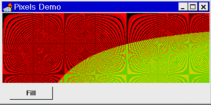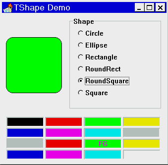 Рис.A: Пример с TShape Во втором примере (проект PIXELS.DPR, рис.2) показано, как осуществить доступ к отдельной точке на изображении (на канве). По нажатию кнопки "Fill" всем точкам изображения присваивается свой цвет: procedure TForm1.Button1Click(Sender: TObject);