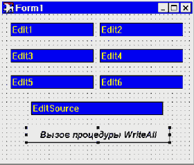 Программа PARAMS позволяет Вам вводить фразы в строки редактирования. После нажатия кнопки "Вызов процедуры WriteAll" строка из управляющего элемента EditSource скопируется в шесть управляющих элементов - строк редактирования, как показано на Рис. Ошибка! Текст указанного стиля в документе отсутствует.-D. Далее мы не будем подробно останавливаться на том, как размещать компоненты на форме - считаем, что это Вы уже умеете. После того как Вы разместили на форме семь компонентов Edit, переименуйте с помощью Инспектора Объектов седьмой компонент (Edit7) в EditSource. Положите на форму компонент Button, и в Object Inspector измените его заголовок (свойство Caption) на "Вызов процедуры WriteAll" (естественно, Вы можете заменить его шрифт, цвет и т.д.).