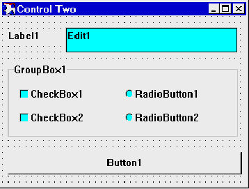 При экспериментах с программой PARAMS Вы можете попробовать изменить имена процедур и параметров. Однако, следует помнить, что ряд слов в Delphi являются зарезервированными, и употреблять их в идентификаторах (именах процедур, функций, переменных, типов, констант) не разрешается - компилятор сразу же обнаружит ошибку. К ним относятся такие слова, как "procedure", "string", "begin", "end" и т.п.; полный же список их приведен в on-line справочнике Delphi. Не старайтесь запомнить сразу все зарезервированные слова - компилятор "напомнит" Вам о неправильном их использовании выдачей сообщения типа "Identifier expected." (Ожидался идентификатор, а обнаружено зарезервированное слово). Более сложные методы и управляющие элементыТеперь, когда Вы освоили базовые понятия в системе программирования Delphi, можно продолжить изучение компонент и способов создания их методов. В программе CONTROL1, рассмотренной в начале урока, был сгенерирован метод, являющийся откликом на событие OnClick строки редактирования Edit1. Аналогично, можно сгенерировать метод, являющийся реакцией на событие OnDblClick. В программе CONTROL2, имеющейся на диске, расширен список находящихся на форме компонентов и для многих из них определены события OnClick и OnDblClick. Для исследования Вы можете просто скопировать файлы проекта CONTROL1 в новую директорию CONTROL2, изменить имя проекта на CONTROL2.DPR (в этом файле после ключевого слова "program" также должно стоять название "CONTROL2") и добавить компоненты Label, GroupBox, CheckBox, RadioButton, Button на форму (эти компоненты находятся на страничке "Standard" Палитры Компонентов). Ваша форма будет иметь примерно следующий вид - Рис. Ошибка! Текст указанного стиля в документе отсутствует.-E.