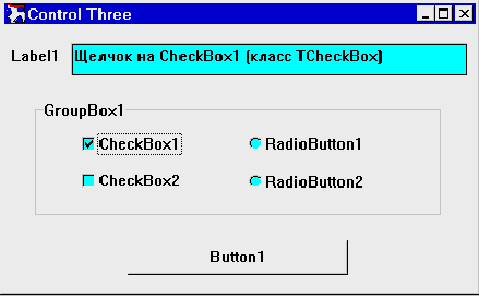 Теперь назначим данные методы всем событиям OnClick и OnDblClick, имеющимся у расположенных на форме объектов. Мы видим, что размер программы существенно сократился, а функциональность ее значительно выросла. В режиме выполнения после, например, щелчка на объекте CheckBox1 приложение будет иметь вид, изображенный на Рис. Ошибка! Текст указанного стиля в документе отсутствует.-F.