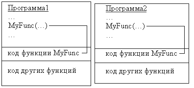 Создание DLL в Delphi (экспорт) Использование DLL в Delphi (импорт) DLL, использующие объекты VCL для работы с данными Исключительные ситуации в DLL Понятие DLLВспомним процесс программирования в DOS. Преобразование исходного текста программы в машинный код включал в себя два процесса - компиляцию и линковку. В процессе линковки, редактор связей, компоновавший отдельные модули программы, помещал в код программы не только объявления функций и процедур, но и их полный код. Вы готовили таким образом одну программу, другую, третью ... И везде код одних и тех же функций помещался в программу полностью (см. рис 1). Программа1 Программа2 : : MyFunc(:) MyFunc(:) : : код функции MyFunc код функции MyFunc код других функций код других функций