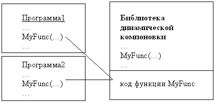 Рис.1 : Вызов функций при использовании статической компоновки В многозадачной среде такой подход был бы по меньшей мере безрассудным, так как очевидно, что огромное количество одних и тех же функций, отвечающих за прорисовку элементов пользовательского интерфейса, за доступ к системным ресурсам и т.п. дублировались бы полностью во всех приложениях, что привело бы к быстрому истощению самого дорогого ресурса - оперативной памяти. В качестве решения возникшей проблемы, еще на UNIX-подобных платформах была предложена концепция динамической компоновки (см. рис . 2).