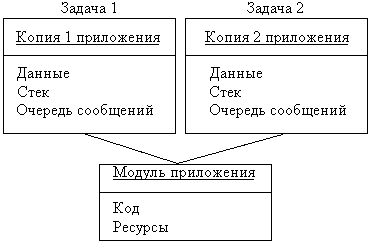 Рис.2: Вызов функций при использовании динамической компоновки Но, чем же отличаются Dynamic Link Library (DLL) от обычных приложений? Для понимания этого требуется уточнить понятия задачи (task), экземпляра (копии) приложения (instance) и модуля (module). При запуске нескольких экземпляров одного приложения, Windows загружает в оперативную память только одну копию кода и ресурсов - модуль приложения, создавая несколько отдельных сегментов данных, стека и очереди сообщений (см. рис. 3), каждый набор которых представляет из себя задачу, в понимании Windows. Копия приложения представляет из себя контекст, в котором выполняется модуль приложения.
