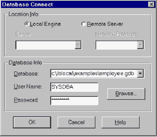Все остальные функции полностью поддерживаются, совпадает даже структура хранения базы на диске. Максимальный размер базы данных Реально ограничение на размер накладывается временем обработки запросов, временем резервного копирования, восстановления базы и т.д. Рекомендуется не более 10 GB. Максимальное количество физических файлов, из которых может состоять база В системных таблицах InterBase поле, описывающее из каких файлов состоит база данных, включая все shadow, имеет тип SHORT. Соответственно не более 65,536. Максимальное количество таблиц в базе данных 65,536. Таблицы нумеруются с использованием типа данных SHORT. Максимальное количество записей в таблице и полей в записи В записи может быть не более 1000 полей. Количество записей в таблице не ограничено. Максимальный размер записи и поля Запись не может быть больше 64К байт (не считая размера BLOB). Поле не может быть больше 32К байт, размер поля типа BLOB не ограничен. Максимальное количество индексов в таблице и базе В базе может быть 64K индексов. В одной таблице - 64 индекса. Максимальное количество уровней вложенности SQL запроса 16 уровней вложенности. Максимальное количество полей в составном индексе Составной индекс может включать в себя не более 16 полей. Максимальный размер stored procedure или trigger Stored procedure или trigger может иметь размер кода не более 48K байт. Количество UDF, определенных в одной базе Длина имени UDF не более 31 символа. Соответственно максимальное количество UDF в базе ограниченно количеством уникальных имен в пределах этой длины. InterBase Interactive SQLВ поставке Delphi есть две утилиты для доступа к базам данных и администрации сервера InterBase. Утилита Windows ISQL позволяет интерактивно выполнять SQL запросы к базе данных и получать результат. Это требуется в двух случаях: для отладки SQL выражения и для управления данными и их структурой. Кроме того, создать базу данных, хранимые процедуры, триггеры, и т.п. также удобнее с помощью ISQL. ISQL позволяет обращаться как к данным на удаленном сервере, так и к локальным (к Local InterBase). Рассмотрим порядок работы с этой программой. Прежде, чем начать работу, нужно либо установить соединение с имеющейся базой данных, либо создать новую базу. Установка соединения После запуска ISQL выберите пункт меню "File|Connect to Database:", появится диалог (см. рис.1), в котором нужно выбрать сервер (удаленный или локальный, в данном случае мы обращаемся к Local InterBase), файл базы данных, указать имя пользователя (SYSDBA - имя системного администратора) и пароль (masterkey - пароль по умолчанию). Если все указано правильно, то по нажатию клавиши "OK" установится соединение с базой данных и можно приступать к дальнейшей работе.