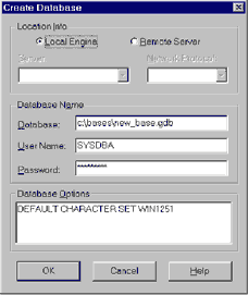 Рис. A: Диалог соединения с базой данных. Создание новой базы данных Эту операцию можно выполнить в пункте меню "File|Create Database" (см. рис.2). В диалоге нужно указать имя файла (c:\bases\new_base.gdb), имя и пароль системного администратора (SYSDBA и masterkey), и, при необходимости, дополнительные параметры. В данном случае создается база данных, поддерживающая русскую кодовую страницу WIN1251. Если Вы собираетесь работать из ISQL с базой данных в русской кодировке, то перед установкой соединения нужно в пункте меню "Session|Advanced Settings" установить "Character set on connect" в WIN1251.