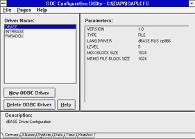 Рис. 7: Диалоговое окно "Add ODBC Driver" позволяет установить драйверы для Access, FoxPro и других баз данных Следующий шаг состоит в создании BDE-надстройки над ODBC-алиасом. Для этого Вам нужно убедиться, что в Вашем директории IDAPI имеется файл IDODBC01.DLL - в противном случае нужно заново установить BDE. После этого можно загрузить утилиту настройки BDE. Если Вы нажмете кнопку "New ODBC Driver" на страничке "Drivers", Вы увидите диалоговое окно, изображенное на рис.7. Название BDE-драйвера, основанного на ODBC-алиасе, по умолчанию, должно начинаться с букв "ODBC_". Поэтому такие буквы уже вынесены перед названием драйвера, так что Вам не нужно их вводить. Введите любое название драйвера и выберите из выпадающих списков сначала ODBC-драйвер, а затем - созданный Вами на его основе ODBC-алиас (Default Data Source Name). Таким образом, мы создали BDE-драйвер, основанный на ODBC-алиасе. После этого BDE-алиас создается стандартным способом, который мы рассмотрели выше. ЗаключениеИтак, на данном уроке мы изучили очень важное для работы с базами данных понятие - алиас, а также научились настраивать его параметры для корректной работы программы. Кроме того, изучены многие вопросы, касающиеся настройки системных параметров. Очень важной для совместимости с базами данных третьих фирм является возможность создавать ODBC-алиасы и работать с ними стандартными средствами BDE. В этот вопрос мы также постарались внести ясность. Назад | Содержание | Вперед