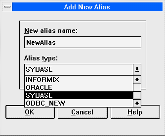 Рис. 2: В диалоговом окне добавления нового алиаса можно указать имя алиаса и тип базы данных После создания нового алиаса его имя появится в списке алиасов на той же страничке "Aliases". Однако просто создать алиас не достаточно. Вам нужно указать дополнительную информацию, содержание которой зависит от типа выбранной базы данных. Например, для баз данных Paradox и dBase (STANDARD) требуется указать лишь путь доступа к данным: