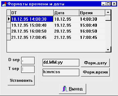 Рис. 3: Программа DateTime демонстрирует работу с форматами даты и времени Как уже отмечалось выше, утилита настройки BDE сохраняет всю конфигурационную информацию в файле IDAPI.CFG. Этот файл с предустановленными ссылками на драйверы и некоторыми стандартными алиасами создается при установке Delphi. Кроме того, он создается при установке файлов редистрибуции BDE (т.е. когда Вы переносите BDE и SQL Links на другие компьютеры). Установка драйверов ODBC и других драйверовПри установке SQL Links для какого-либо SQL-сервера Вам не требуется "вручную" добавлять драйверы связи с этим сервером - программа установки SQL Links сделает это автоматически. Заметим, что при установке Delphi Client-Server автоматически устанавливаются также и SQL Links, так что отдельно их инсталляцию проводить не требуется. Вам останется только подправить некоторые параметры (например, языковый драйвер) для установленных драйверов. Но кроме "родных" SQL Links, для доступа к SQL-серверам (и локальным базам данных) можно использовать ODBC-драйверы. Delphi использует Microsoft 2.0 ODBC Driver Manager. Если Вы имеете версию ODBC Driver Manager, отличную от указанной - сохраните существующие файлы ODBC.DLL и ODBCINST.DLL и скопируйте файлы ODBC.NEW и ODBCINST.NEW из директория IDAPI в Ваш ODBC-директорий (по умолчанию, это поддиректорий SYSTEM в "виндусовом" директории) и переименуйте их соответственно в ODBC.DLL и ODBCINST.DLL.