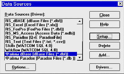 Рис. 5: Список ODBC-алиасов с указанием ODBC-драйверов Установка ODBC-драйвера начинается с проверки того, какие драйверы уже находятся в Вашей системе. Для этого в Панели Управления (Control Panel) найдите иконку "ODBC" (рис. 4), которая запускает утилиту конфигурации ODBC. В ее диалоговом окне представлен список ODBC-алиасов (Data Source) с указанием в скобках ODBC-драйверов, на которых они основаны (рис. 5).