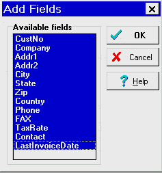 Рис.1: Диалог Add Fields Редактора DataSet. По-умолчанию, все поля в диалоге выбраны. Нажмите на кнопку OK, чтобы выбрать все поля, и закройте редактор. Снова загляните в "Object Selector", теперь здесь появилось несколько новых объектов, (см. рис.2)