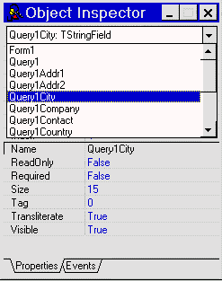 Рис.2: Object Selector показывает в списке все объекты созданные в Редакторе DataSet. Вы можете также найти этот список в определении класса TForm1. Эти новые объекты будут использоваться для визуального представления таблицы CUSTOMER пользователю. Вот полный список объектов, которые только что созданы: Query1CustNo: TFloatField; Query1Company: TStringField; Query1Addr1: TStringField; Query1Addr2: TStringField; Query1City: TStringField; Query1State: TStringField; Query1Zip: TStringField; Query1Country: TStringField; Query1Phone: TStringField; Query1FAX: TStringField; Query1TaxRate: TFloatField; Query1Contact: TStringField; Query1LastInvoiceDate: TDateTimeField; Я вырезал и вставил этот список из определения класса TForm1, которое можно найти в окне Редактора исходного текста. Происхождение имен показанных здесь, должно быть достаточно очевидно. Часть "Query1" берется по-умолчанию от имени объекта TQuery, а вторая половина от имени поля в таблице Customer. Если бы мы сейчас переименовали объект Query1 в Customer, то получили бы такие имена: CustomerCustNo CustomerCompany Это соглашение может быть очень полезно, когда Вы работаете с несколькими таблицами, и сразу хотите знать, на поле какой таблицы ссылается данная переменная. Любой объект, созданный в редакторе DataSet является наследником класса TField. Точный тип потомка зависит от типа данных в конкретном поле. Например, поле CustNo имеет тип TFloatField, а поле Query1City имеет тип TStringField. Это два типа полей, которые Вы будете встречать наиболее часто. Другие типы включают тип TDateTimeField, который представлен полем Query1LastInvoiceDate, и TIntegerField, который не встречается в этой таблице. Чтобы понять, что можно делать с потомками TField, откройте Browser, выключите просмотр полей Private и Protected, и просмотрите свойства и методы Public и Published соответствующих классов. Наиболее важное свойство называется Value. Вы можете получить доступ к нему так: procedure TForm1.Button1Click(Sender: TObject); var d: Double; S: string; begin d := Query1CustNo.Value; S := Query1Company.Value; d:=d+1; S := 'Zoo'; Query1CustNo.Value := d; Query1Company.Value := S; end; В коде, показанном здесь, сначала присваиваются значения переменным d и S. Следующие две строки изменяют эти значения, а последний две присваивают новые значения объектам. Не имеет большого смысла писать код, подобный этому, в программе, но этот код служит лишь для того, чтобы продемонстрировать синтаксис, используемый с потомками TField. Свойство Value всегда соответствует типу поля, к которому оно относится. Например у TStringFields - string, TCurrencyFields - double. Однако, если вы отображаете поле типа TCurrencyField с помощью компонент, "чувствительных к данным" (data-aware: TDBEdit, TDBGrid etc.), то оно будет представлена строкой типа: "$5.00". Это могло бы заставить вас думать, что у Delphi внезапно отключился строгий контроль типов. Ведь TCurrencyField.Value объявлена как Double, и если Вы пробуете присвоить ему строку, Вы получите ошибку "type mismatch" (несоответствие типа). Вышеупомянутый пример демонстрирует на самом деле свойства объектов визуализации данных, а не ослабление проверки типов. (Однако, есть возможность получить значение поля уже преобразованное к другому типу. Для этого у TField и его потомков имеется набор методов типа AsString или AsFloat. Конечно, преобразование происходит только тогда, когда имеет смысл.) Если нужно получить имена полей в текущем DataSet, то для этого используется свойство FieldName одним из двух способов, показанных ниже: S := Query1.Fields[0].FieldName; S := Query1CustNo.FieldName; Если вы хотите получить имя объекта, связанного с полем, то вы должны использовать свойство Name: S := Query1.Fields[0].Name; S := Query1CustNo.Name; Для таблицы CUSTOMER, первый пример вернет строку "CustNo", а любая 