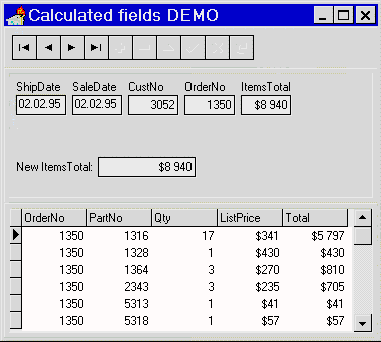 В данном примере сумма подсчитывается с помощью простого перебора записей, это не самый оптимальный вариант - можно, например, для подсчета суммы использовать дополнительный объект типа TQuery. Метод DisableControls вызывается для того, чтобы отменить перерисовку DBGrid при сканировании таблицы. Запрос Query2 переоткрывается для уверенности в том, что его текущий набор записей соответствует текущему заказу. Поместите на форму еще один элемент DBEdit и привяжите его к Query1, полю NewItemsTotal. Запустите программу, ее примерный вид показан на рис.3