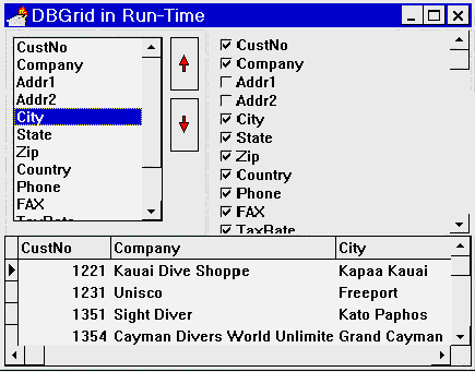 Большая часть кода в этом примере выполняет относительно простые задачи, типа назначения имен и положений check boxes. Вот две ключевых строки: R[I] := TCheckBox.Create(Self); R[I].Parent := ScrollBox1; Первая строки создает CheckBox с заданным Owner (Владельцем). Вторая строки назначает Parent (Родителя) для CheckBox. Чтобы понять различия между Родителем и Владельцем, посмотрите соответствующие свойства в online-help. Программа содержит ListBox, который показывает текущий порядок полей в DataSet. Для изменения порядка полей в DataSet (а, следовательно, в DBGrid) используются две кнопки. При нажатии на одну из кнопок, выбранное в ListBox'е поле перемещается на одну позицию вверх или вниз. Синхронно с этим меняется и порядок полей в DBGrid. Код, показанный ниже, изменяет Index поля для Table1, изменяя, таким образом, позицию поля в DBGrid. Эти изменения касаются только визуального представления DataSet. Физически данные на диске не изменяются. procedure TForm1.downButtonClick(Sender: TObject);