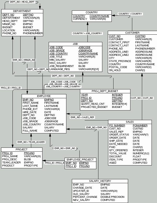 Интерактивный SQL используется в специальных утилитах (типа WISQL или DBD), позволяющих в интерактивном режиме вводить запросы с использованием команд SQL, посылать их для выполнения на сервер и получать результаты в предназначенном для этого окне. Встроенный SQL используется в прикладных программах, позволяя им посылать запросы к серверу и обрабатывать полученные результаты, в том числе комбинируя set-ориентированный и record-ориентированный подходы. Мы не будем приводить точный синтаксис команд SQL, вместо этого мы рассмотрим их на многочисленных примерах, что намного более важно для понимания SQL, чем точный синтаксис, который можно посмотреть в документации на Вашу СУБД. Итак, начнем с рассмотрения команд языка манипулирования данными. Реляционные операции. Команды языка манипулирования даннымиНаиболее важной командой языка манипулирования данными является команда SELECT. За кажущейся простотой ее синтаксиса скрывается огромное богатство возможностей. Нам важно научиться использовать это богатство! На данном уроке предполагается, если не оговорено противное, что все команды языка SQL вводятся интерактивным способом. В качестве информационной основы для примеров мы будем использовать базу данных "Служащие предприятия" (employee.gdb), входящую в поставку Delphi и находящуюся (по умолчанию) в поддиректории \IBLOCAL\EXAMPLES. Рис. 1: Структура базы данных EMPLOYEE На рис.1 приведена схема базы данных EMPLOYEE для Local InterBase, нарисованная с помощью CASE-средства S-Designor (см. доп. урок). На схеме показаны таблицы базы данных и взаимосвязи, а также обозначены первичные ключи и их связи с внешними ключами. Многие из примеров, особенно в конце урока, являются весьма сложными. Однако, не следует на этом основании делать вывод, что так сложен сам язык SQL. Дело, скорее, в том, что обычные (стандартные) операции настолько просты в SQL, что примеры таких операций оказываются довольно неинтересными и не иллюстрируют полной мощности этого языка. Но в целях системности мы пройдем по всем возможностям SQL: от самых простых - до чрезвычайно сложных. Начнем с базовых операций реляционных баз данных. Таковыми являются: