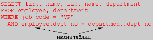 Операции соединения подразделяются на два вида - внутренние и внешние. Оба вида соединений задаются в предложении WHERE запроса SELECT с помощью специального условия соединения. Внешние соединения (о которых мы поговорим позднее) поддерживаются стандартом ANSI-92 и содержат зарезервированное слово "JOIN", в то время как внутренние соединения (или просто соединения) могут задаваться как без использования такого слова (в стандарте ANSI-89), так и с использованием слова "JOIN" (в стандарте ANSI-92). Связывание производится, как правило, по первичному ключу одной таблицы и внешнему ключу другой таблицы - для каждой пары таблиц. При этом очень важно учитывать все поля внешнего ключа, иначе результат будет искажен. Соединяемые поля могут (но не обязаны!) присутствовать в списке выбираемых элементов. Предложение WHERE может содержать множественные условия соединений. Условие соединения может также комбинироваться с другими предикатами в предложении WHERE. Внутренние соединения Внутреннее соединение возвращает только те строки, для которых условие соединения принимает значение true. SELECT first_name, last_name, department FROM employee, department WHERE job_code = "VP" получить список сотрудников, состоящих в должности "вице-президент", а также названия их отделов