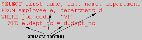 В вышеприведенном запросе использовался способ непосредственного указания таблиц с помощью их имен. Возможен (а иногда и просто необходим) также способ указания таблиц с помощью алиасов (псевдонимов). При этом алиасы определяются в предложении FROM запроса SELECT и представляют собой любой допустимый идентификатор, написание которого подчиняется таким же правилам, что и написание имен таблиц. Потребность в алиасах таблиц возникает тогда, когда названия столбцов, используемых в условиях соединения двух (или более) таблиц, совпадают, а названия таблиц слишком длинны... Замечание 1: в одном запросе нельзя смешивать использование написания имен таблиц и их алиасов. Замечание 2: алиасы таблиц могут совпадать с их именами.