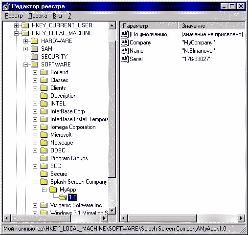 Рис. 2. Заставка на этапе выполнения Совет 2. Вывод информации о приложении на заставкеЕсли запустить какое-либо из приложений MS Office 97, на появляющейся при загрузке приложения заставке можно увидеть не только сведения о самом приложении, но также и регистрационный номер и фамилию пользователя. Как известно, эти сведения вводятся пользователем в процессе установки приложения, и в настоящее время принято хранить подобные сведения в реестре Windows. Если создать дистрибутив приложения с помощью наиболее часто используемого в нашей стране для этой цели средства InstallShield (или с помощью InstallShield Express, входящего в состав старших версий Delphi и C++Builder), в реестре Windows появится раздел, похожий на представленный на рис.3: