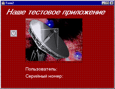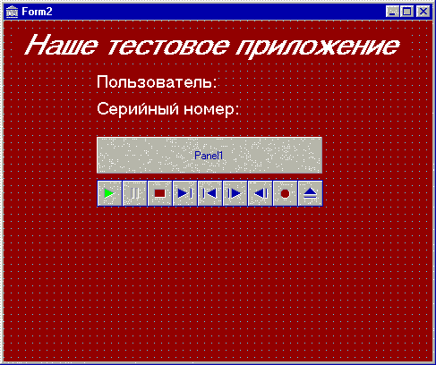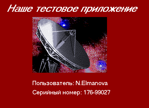 Рис. 5. Заставка с именем пользователя и серийным номером на этапе выполнения Если же в реестре нет такого раздела, вместо имени пользователя и серийного номера булет выводиться сообщение о том, что пользователь не зарегистрирован. Отметим, что при желании можно добавить в этот обработчик события код, анализирующий серийный номер и в случае, если он не удовлетворяет каким-либо заранее заданным требованиям, прекратить выполнение приложения (или запустить его демонстрационную версию). Совет 3. Заставка с видеофрагментомТеперь создадим заставку, в которой будет отображаться видеофрагмент (такие заставки нередко используются разработчиками игр и мультимедиа-энциклопедий). С этой целью удалим с формы таймер (он уже не нужен, так как время существования заставки теперь определяется длительностью видеофрагмента), и уничтожим связанный с ним обработчик события OnTimer. Удалим также компонент TImage. Затем добавим компонент TPanel (он будет использоваться в качестве "экрана" для воспроизведения видеофрагмента, и компонент TMediaPlayer. Свойство Visible этого компонента установим равным false, свойство AutoOpen - раным true, а в качестве значения свойства FileName выберем имя файла, содержащего видеофрагмент.